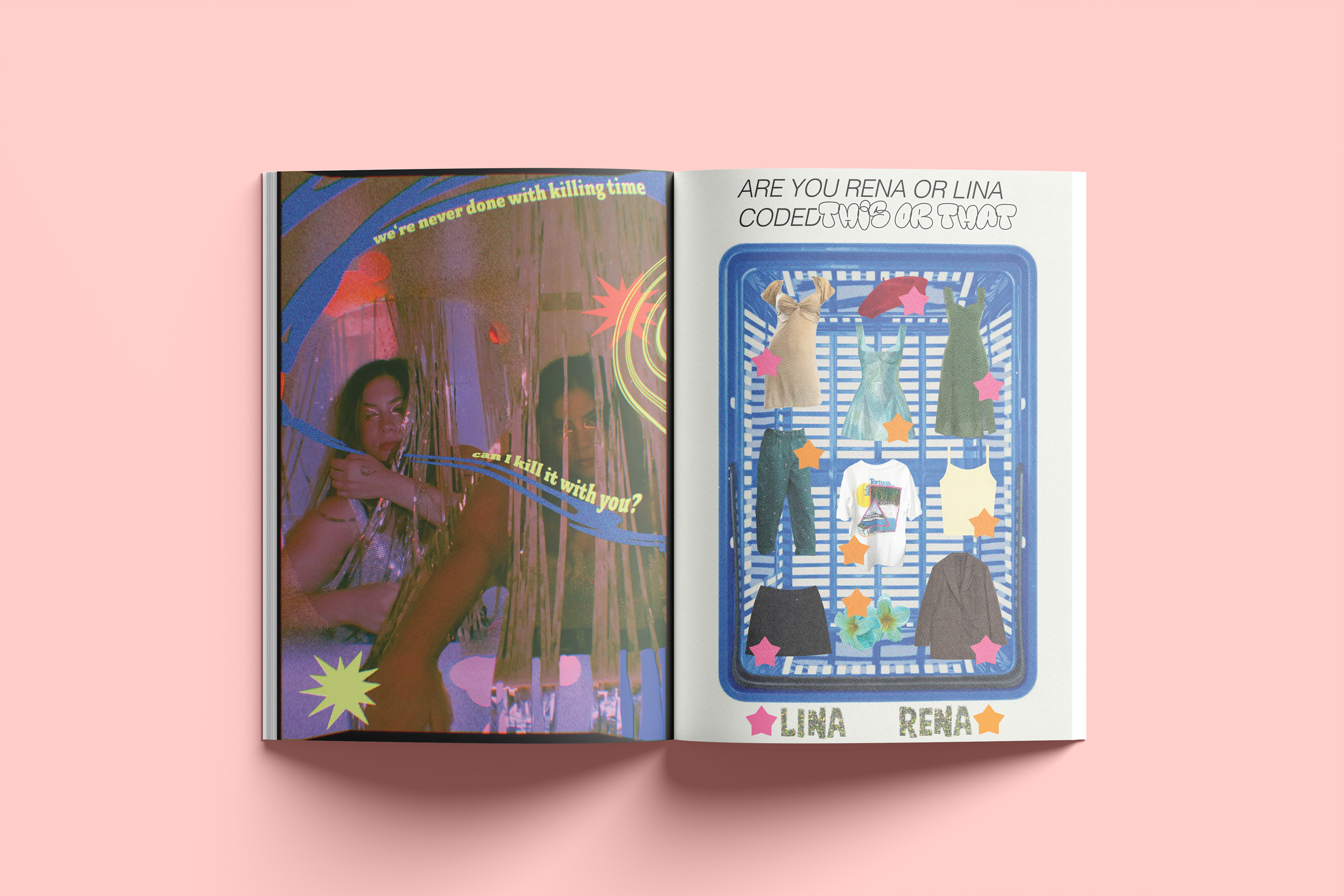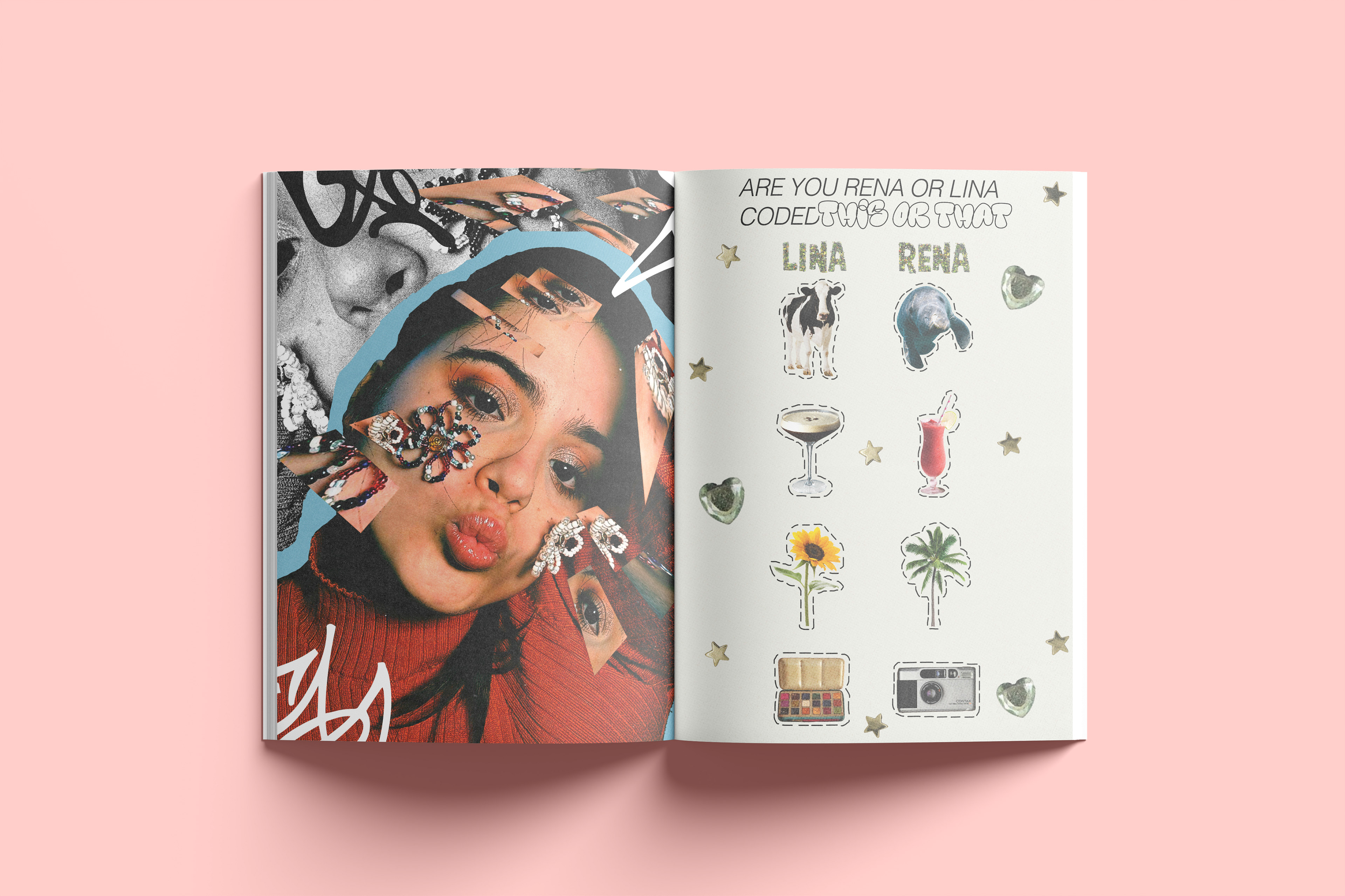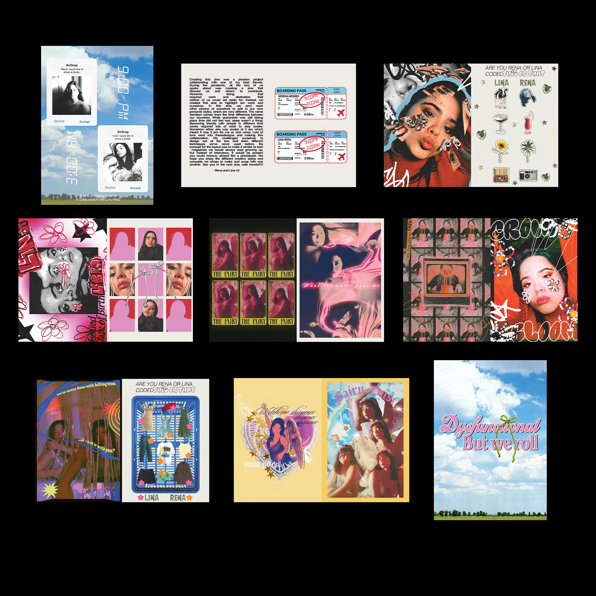 A zine was created by me with the collaboration with my friend. We swapped photos of each other and edited them in our styles. I wanted it to feel sort of like a teen magazine